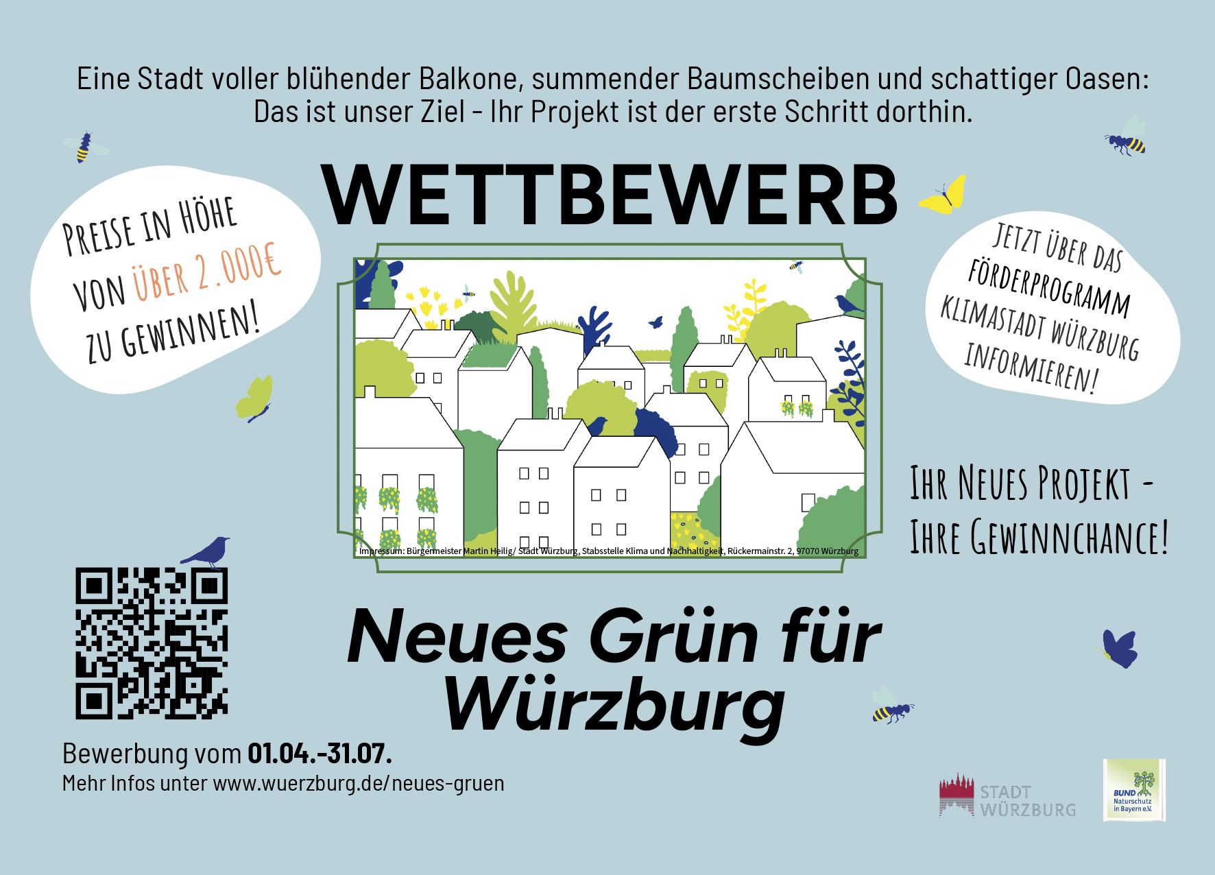 Der Klimawandel macht sich auch in Würzburg bemerkbar: Heiße Sommer und lange Trockenperioden belasten Mensch und Natur, Beton- und Asphaltflächen verstärken diese Effekte zusätzlich. Begrünte Flächen kühlen die Umgebung, spenden Sauerstoff und bieten wertvollen Lebensraum für die Artenvielfalt. Deshalb veranstaltet die Stadt Würzburg in Zusammenarbeit mit der Kreisgruppe Würzburg des BUND Naturschutz den Wettbewerb „Neues Grün für Würzburg“.
