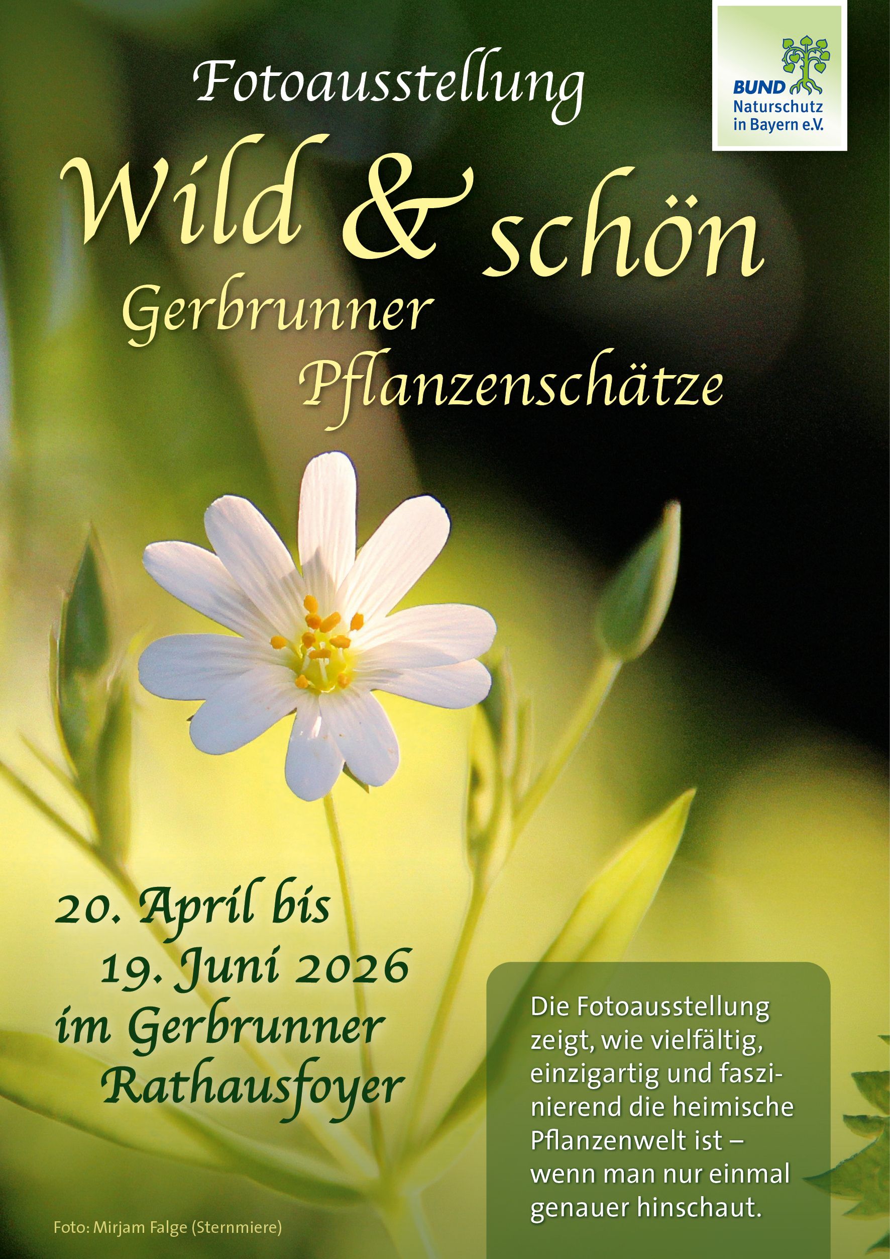 Die Fotoausstellung „Wild & schön – Gerbrunner Pflanzenschätze“ rückt diese besonderen Wildpflanzen aus Gerbrunn in den Mittelpunkt. Mit eindrucksvollen Aufnahmen zeigt die Ausstellung, wie vielfältig, einzigartig und faszinierend die heimische Pflanzenwelt ist – wenn man nur einmal genauer hinschaut. Und genau dazu lädt die Ausstellung mit ihrem Begleitprogramm ein.